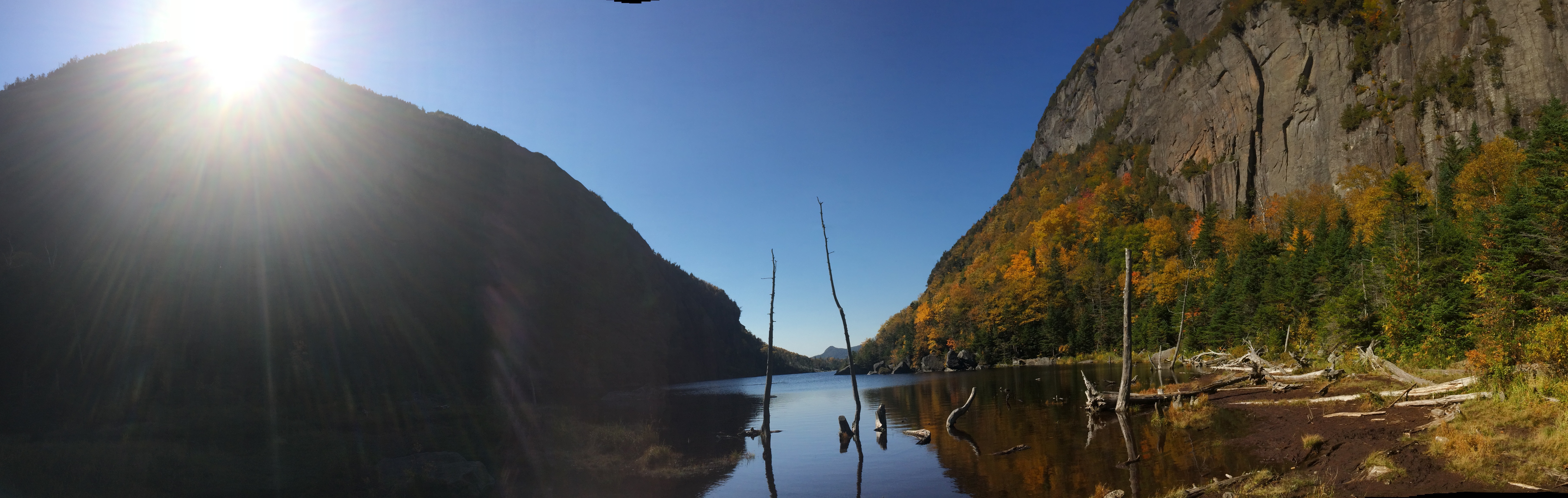 But it was so worth it. The summit gives you grand views of Lake Colden, Flowed Lands and Avalanche Lake and the MacIntyre Range of Algonquin, Wright and Iroquois opening up in front of you. It was 80’s, clear, sunny and hardly a breeze. Made for one hell of a view. And the fall foliage to the north was vibrant even if my pictures don’t do it justice.