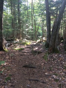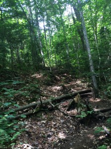 The first 2/3 is moderate, pretty walk/hike in the woods, and easy to follow. Some turns, varying degrees of rolling ascents/descends, wooded, gravel, etc. but I found that is breezed by. Supposedly, there is a waterfall at around .9 – but I saw none. There was a long open chute with water coming down that may have once been a waterfall. I also read descriptions of bever damns and hard blow down, but I saw none indication of them.