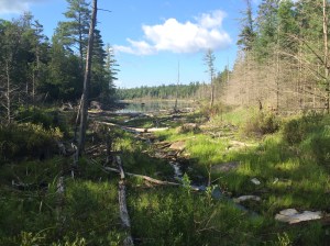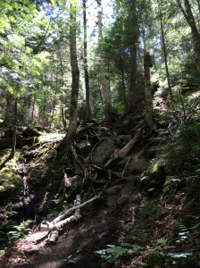 Steady climb up Skylight Valley for about. 7 miles, as you walk parallel to Skylight Brook, although moving away from it. You’ll be in the trees with rough footing and your first real taste of elevation gain. Allen Brook will come in, and you’ll be in and out of the trees and Brook. Varying degree of scrambles, slippery rock, root climbs, etc. You know – the usual steep, herdless climb, I’ve come to bond with in the ADKs.